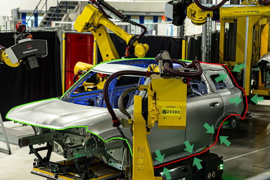 Měřicí systém surfaceCONTROL Automotive se používá pro plně automatickou detekci vad na karoseriích. Tento systém využívá projekci pruhového světla na difuzně odrážející povrchy a pomocí strojového učení detekuje lokální vady tvaru, jako jsou otisky, praskliny a propadliny, s vysokou přesností a opakovatelností.
