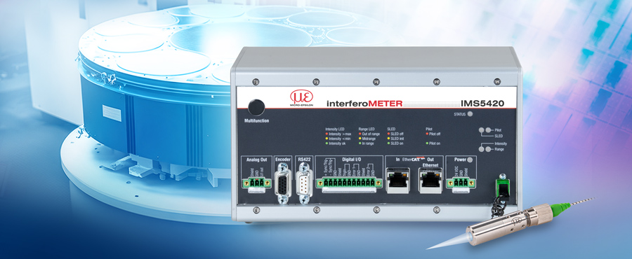 The interferoMETER IMS5420 is available either as a thickness measuring system or as a multi-peak (MP) version for thickness measurement of up to five layers (e.g. wafer thickness, air gap, film and coatings > 50 µm) with silicon thicknesses from 0.05 to 1.05 mm. The measurable thickness of air gaps is up to 4 mm. In addition, a version of the controller with IP67 protection, a stainless steel housing and suitable fibre optics/sensors is available for thickness measurements during lapping or for use in other harsh industrial environments.